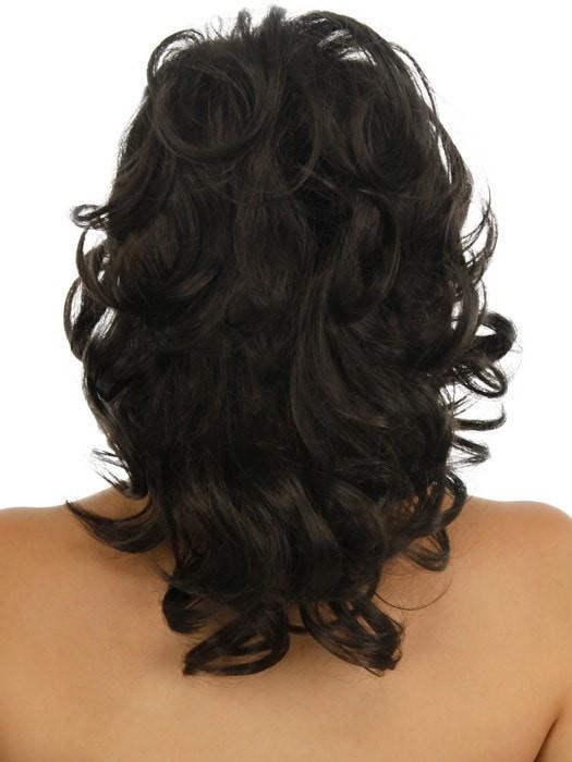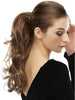 This mid-length, wavy layered ponytail clips on with claw comb or optional drawstring bun base. The style is reversible as well. Depending on which direction the hairpiece is applied the hair style appears more or less wavy.