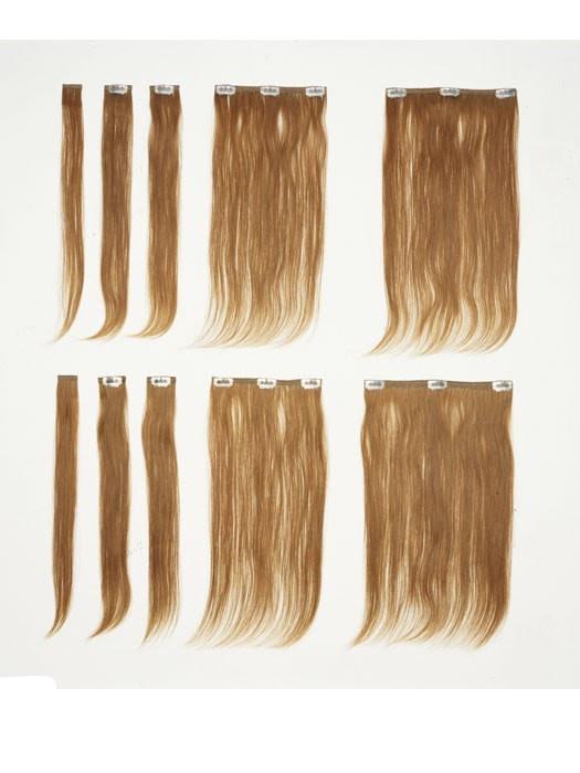 Raquel Welch 100% human hair clip-in extensions are made from the finest quality human hair. Available in nine colors levels, these extensions permed to match any client's needs. Lightweight and easy to attach, these virtually undetectable extensions can be put in and taken out in a matter of minutes. Thin and fine hair becomes thick and full. Short hair transforms to long, luxurious hair. Each set consists of (10) ten 14" long pieces in varying weft widths: 4 pieces - 1.5" wide, 2 pieces - 6" wide, 1 piece - 7" wide, 1 piece - 8" wide, plus 2 pieces - 1" wide to be used for testing perm and color. This package includes a detailed styling, care and maintenance guide.