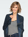 Ahead of the Curve from the Signature Collection by Raquel Welch checks all of the boxes. Sophisticated layers, bounced body, and the perfect diagonal long bang. The extended lace front and mono side part allows the most natural looking hairline. Simply brush the part, curve the ends under, and go!