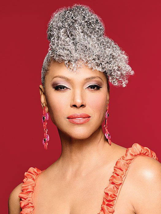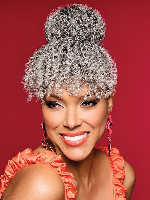 Bombshell Bun & Bangs by Kim Kimble is a drawstring pocket bun that easily attaches to your hair with combs. The Tru2life heat friendly synthetic fiber is styled into tight corkscrew curls to create natural texture and bounce.