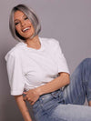 Model is wearing DUA in color ROSEWOOD-BROWN-SHADED | Medium Brown, Caramel, and Rose Gold blend with Dark shaded Roots