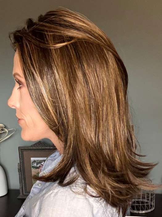 Full Finesse by Gabor presents a lovely length with long, tapered layers and curtain bangs that beautifully frame the face. Part of the Designer Series, the Tru2Life heat friendly synthetic fiber offers endless styling potential! The wide center monofilament part mimics natural hair growth for a realistic appearance. The extended lace front creates a realistic hairline for off-the-face hairstyling.
