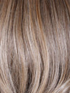 Model is wearing KELLY BY BELLETRESS in color MILKSHAKE BLONDE-R 12/19/23+8 | A cool-toned, multidimensional blonde featuring light sandy brown, ash blonde, and touches of platinum, grounded by medium brown roots for natural depth and realism.