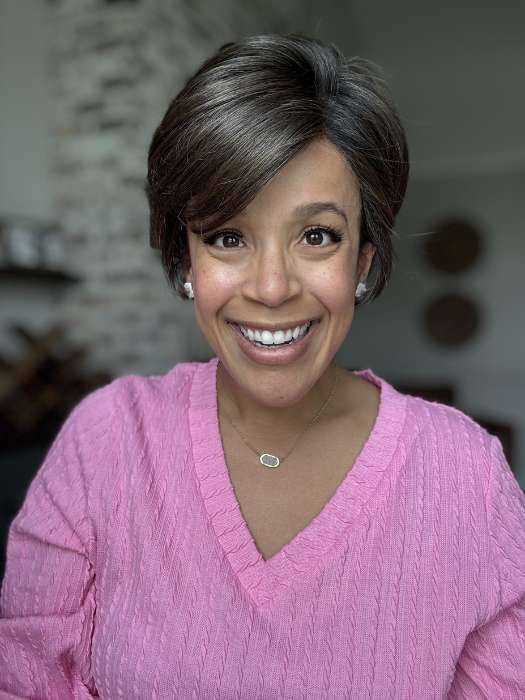 Roxie wearing MONOLOGUE by RAQUEL WELCH in RL51/61 ICED GRANITA | Lightest Grey Progresses to a Deep Grey at the Nape