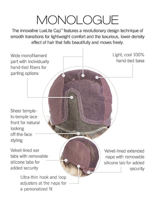 Monologue by Raquel Welch is part of their Sheer Luxury Collection. This heat friendly synthetic wig features a classic cropped hairstyle with soft, razor cut layers and asymmetrical fringe for a contemporary hairstyle. The LUXLITE cap is ultra lightweight and comfortable with its monofilament part and 100% hand tied base. The temple to temple lace front gives you a realistic-looking hairline.