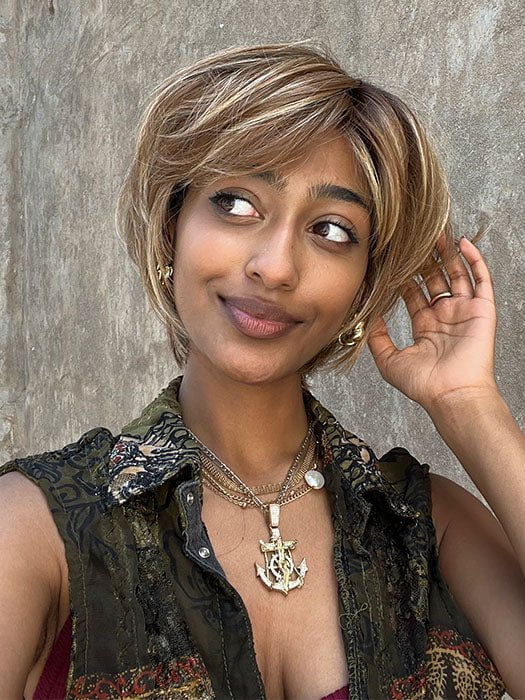 Stella Star by Jon Renau is part of the HD Collection. Designed by Jon Renau’s co-founder and designer Stella Reynolds, this short heat friendly wig sports a sleek bob haircut with longer hair in the nape area. The hair is designed with heat resistant synthetic fiber, so you can smooth out the hair or flip out the ends for more texture. Its low permatease and lace front create a realistic appearance.