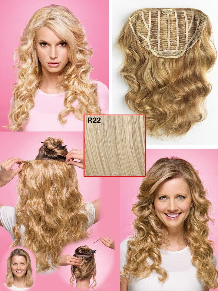 Now you can create full glamorous curls in just minutes. The 22" relaxed curl hairdo by Jessica Simspon is a 1 piece hair extensions system that attaches to your own hair using 7 pressure sensitive clips.
