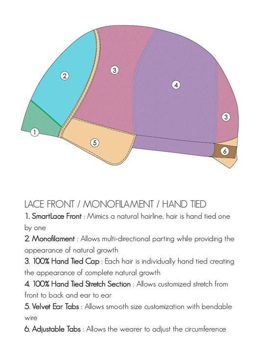 The cap is 100% hand-tied, meaning each hair is individually knotted, allowing free movement and styling versatility. No matter where you part it, the full monofilament top gives a scalp-like appearance. The SmartLace™ front allows the freedom of styling your hair away from the face, giving you endless styling options. This top-of-the-line wig is a must-have for the woman wanting the most natural look.