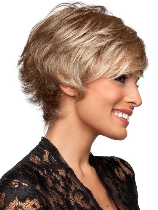Intimate Petite wig by Raquel Welch is a fresh take on the classic boy cut. This ready-to-wear style features a light, cool fit. Short straight layers throughout the crown give you maximum volume and height. Slightly waved layers at the sides and back, blend seamlessly into an extended nape. Feathered bangs complete the look beautifully. Intimate looks great tousled and textured or smooth and sleek, the choice is up to you!