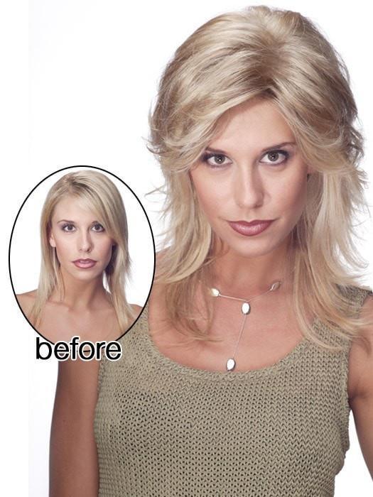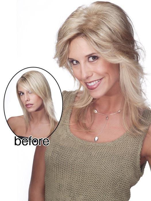 The Mono Short by Jon Renau is a monofilament hairpiece constructed of synthetic fiber. The base of the hairpiece measures 6.5”x5.75” and the overall hair length is 9”–11”. The monofilament fiber is sheer allowing it to blend in with all skin tones and the construction allows for easy styling and multi-directional parting. This hair addition is great for adding extra volume to thinning crown hair. Have a professional trim in a bang, layers, or customize the piece to blend with your natural hair.