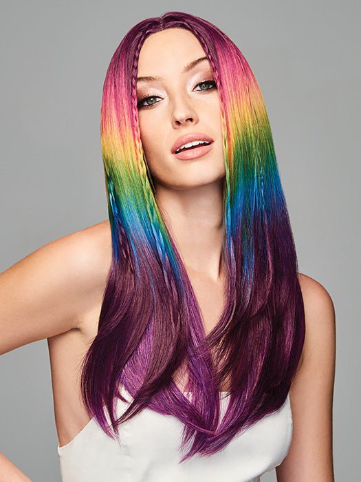 Party All Night by Hairdo contrasts a bright, iridescent rainbow against a deep purple base. Your colorful ‘do will look as natural as ever with the monofilament center part paired with a lace front hairline. Rock it straight or wavy with heat-friendly Tru2Life fiber.