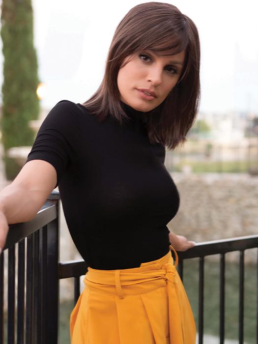 Premium Luxury by Gabor has the layers and bangs you love from the original style, Premium. With an extended lace front and hand tied top, this synthetic style is comfortable and supremely natural-looking. The versatility of the upgraded top construction allows you to change your hair parting, so opt for full bangs one day and swooping side bangs the next!