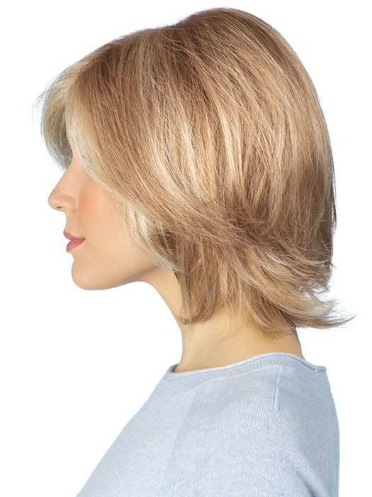 Victoria by Amore is a trend-setting color length flip style with textured edges. This style features a double monofilament top, which creates the appearance of natural hair growth, allows you to change the location of the part, and it’s more comfortable because of the extra layer of monofilament. Open wefting in the back and sides of the cap allows for better air ventilation, making it cooler on your scalp. And the ready-to-wear synthetic hair looks and feels like natural hair.