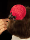 This beautiful red powder puff on a black satin handle contains a hypoallergenic, lightly scented mattifying powder to easily and elegantly remove the high gloss finish of synthetic fibers. Say goodbye to unwanted shine. Powder leaves synthetic hair looking natural and touchably soft.